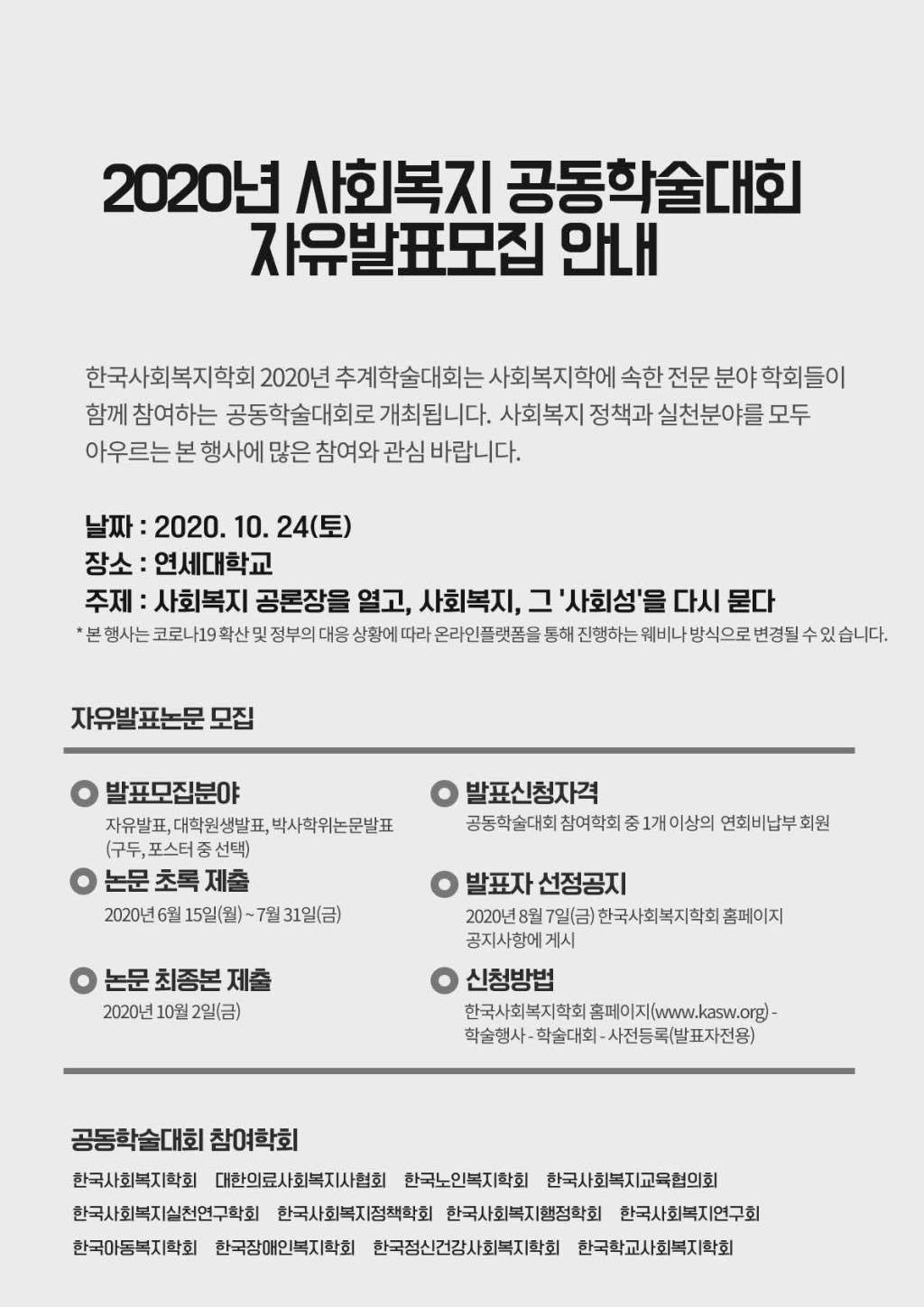 한국노인복지학회는 한국사회복지학회와 공동으로 '사회복지 공론장을 열고, 사회복지, 그 '사회성'을 다시 묻다‘를 주제로 2020년 10월 24일 서울 연세대학교에서 '사회복지 공동학술대회'를 개최합니다.