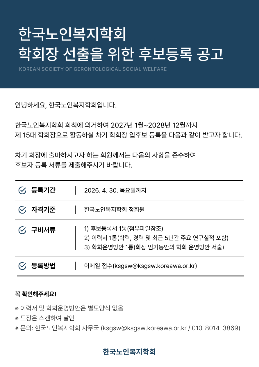 한국노인복지학회 회칙에 의거하여 2027년 1월~2028년 12월까지 제 15대 학회장으로 활동하실 차기 학회장 입후보 등록을 다음과 같이 받고자 합니다.