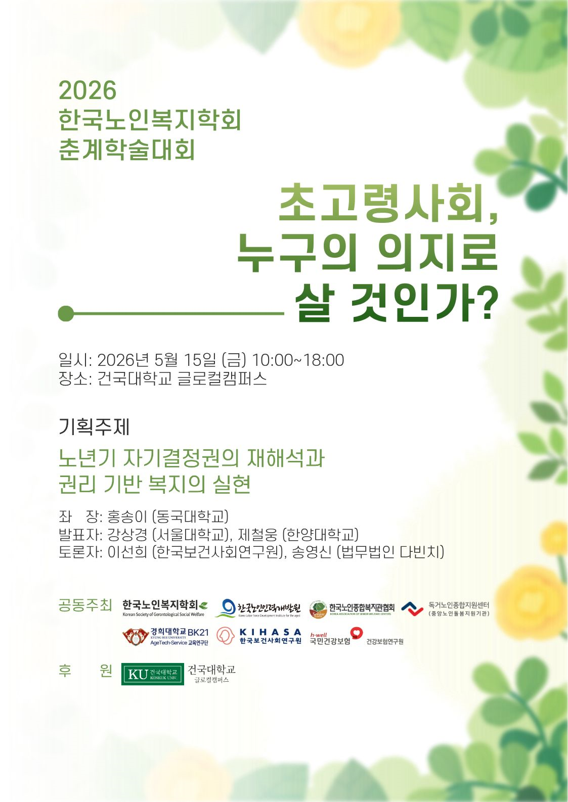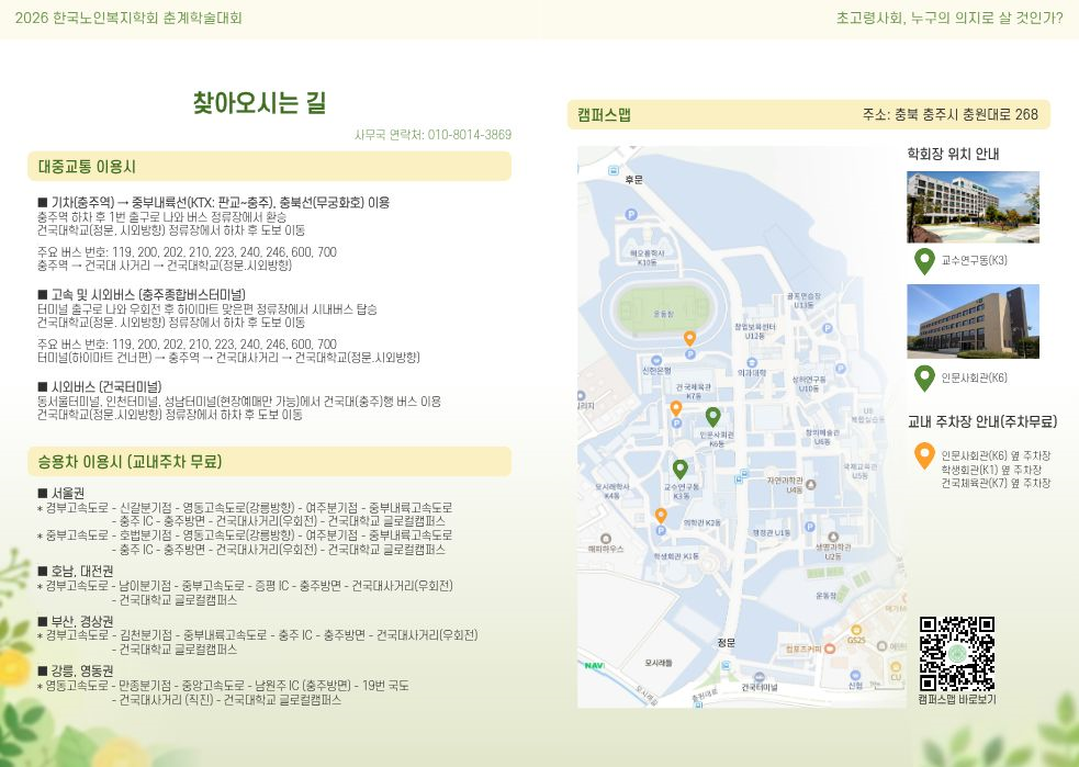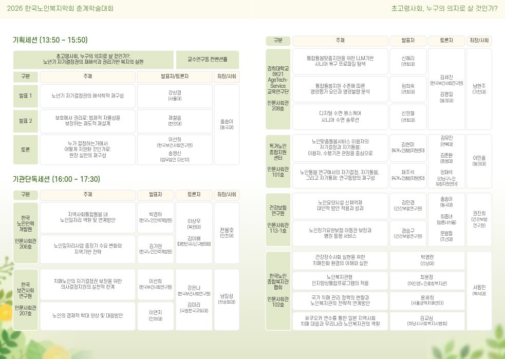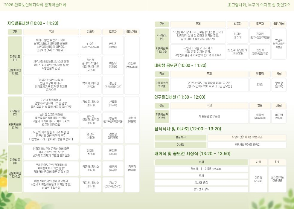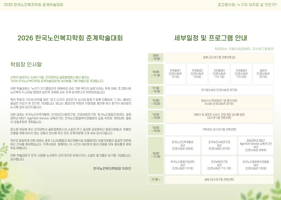 2026년 한국노인복지학회 춘계학술대회 세부일정 및 사전등록 방법을 다음과 같이 안내드리오니 많은 관심과 참여 부탁드립니다.
